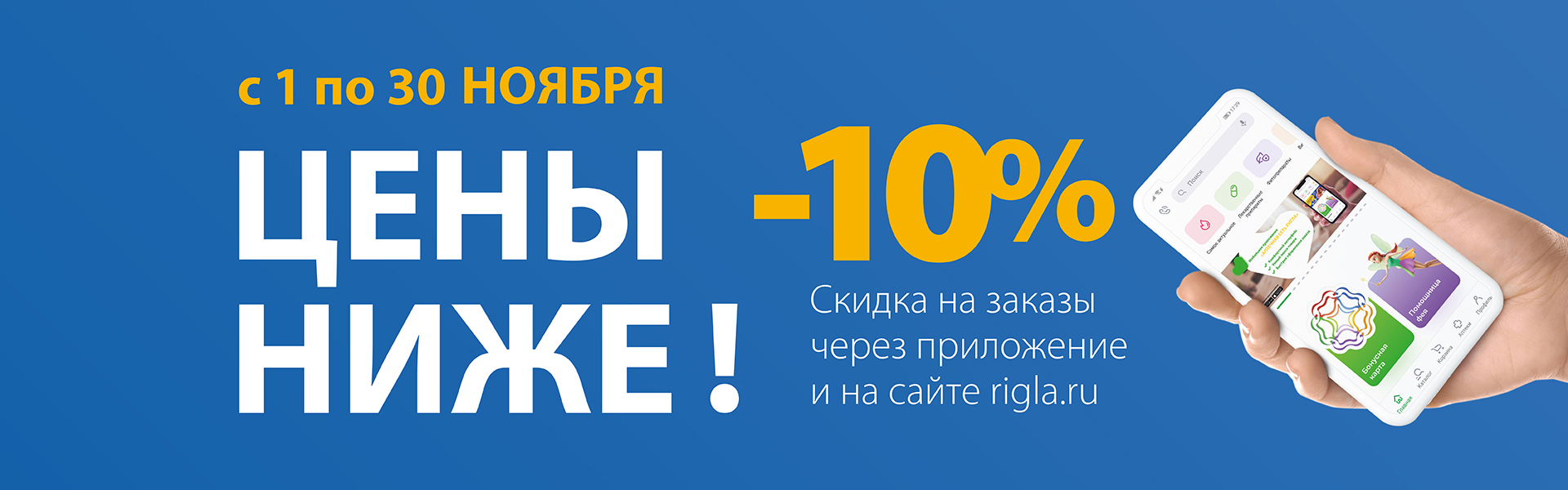 *кроме Аллокин-Альфа, Арепливир, мед. маски Акция проводится с 1 ноября, 2020 г. по 30 ноября, 2020 г. на заказы в интернет-аптеке «Ригла» или через мобильное приложение «Ригла аптечная сеть» предоставляется скидка 10%. Скидка действует только в Архангельской области и Республике Коми. Скидка 10% предоставляется на все товары, кроме товаров Аллокин-Альфа лиоф. д/р-ра для п/к введ. 1мг №3, Аллокин-Альфа лиоф. д/р-ра для п/к введ. 1мг №6, Арепливир таб.п/о плен. 200мг №40, Ригла маска медицинская трехслойная одноразовая №5, Ферстэйд маска медицинская №5 и товаров по специальному предложению. Организатор акции – ООО «Ригла», ИНН 7724211288. Организатор акции вправе вносить изменения в условия акции без предварительного уведомления или отменить акцию. Подробности акции и полный список аптек, участвующих в акции, уточняйте на сайте www.rigla.ru и по телефону 8-800-777-0303. |
