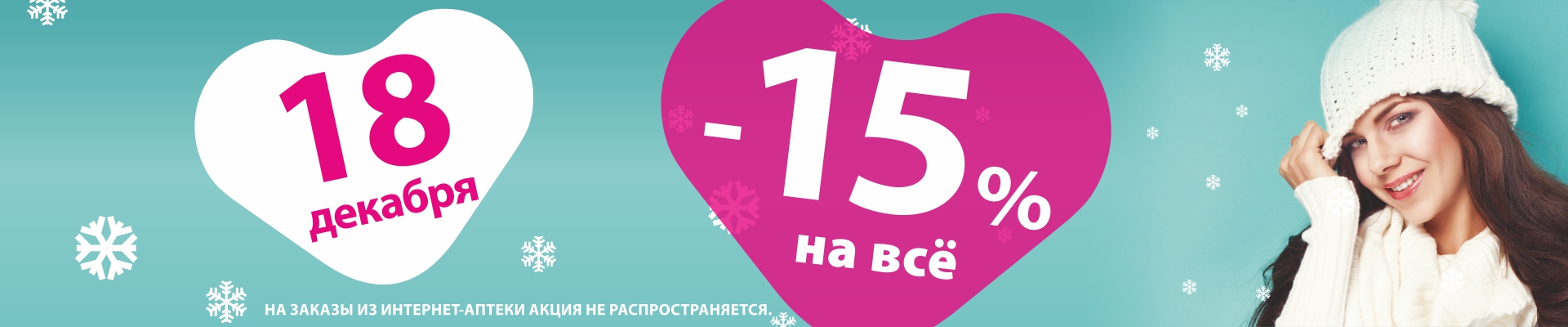Акция скидка 15% действует 18 декабря 2019 года в аптеках «Ригла» в Краснодарском крае. Скидка распространяется на весь ассортимент. На продукцию, приобретенную по акции, дополнительные скидки не распространяются, кроме начисления и списания бонусов по программе лояльности «Аптечный кошелек» и «Спасибо от Сбербанка». После применения скидки по акции возможно начисление и списание акционных бонусов по «Зимней» акции или по программе лояльности «Спасибо от Сбербанка». Применяется только одна программа лояльности. Если товар участвует в нескольких акциях со скидками, то применяется наибольшая из возможных скидок.