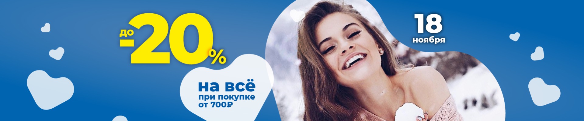 Акция действует в аптеках «Ригла» г. Санкт-Петербурга, Ленинградской области, Новгородской области, Псковской области , Республике Карелия 18 ноября 2020 г. при покупке от 700 руб. предоставляется скидка 20%. Скидка распространяется на весь ассортимент, кроме Аллокин-Альфа лиоф. д/р-ра для п/к введ. 1мг №3, Аллокин-Альфа лиоф. д/р-ра для п/к введ. 1мг №6, Арепливир таб.п/о плен. 200мг №40, Ригла маска медицинская трехслойная одноразовая №5, Ферстэйд маска медицинская №5.