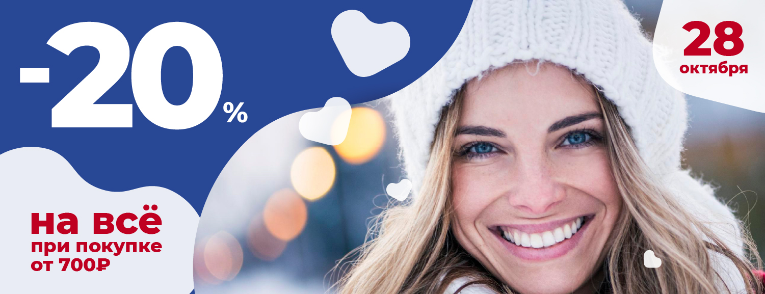 Акция действует 28 октября, 2020 г. в аптеках «Ригла» в Санкт-Петербурге и Ленинградской области, Великом Новгороде и Новгородской области, Пскове и Псковской области и Республике Карелии. На чеки от 700 руб. и более предоставляется скидка 20%. Скидка распространяется на весь ассортимент, кроме товаров Аллокин-Альфа лиоф. д/р-ра для п/к введ. 1мг №3, Аллокин-Альфа лиоф. д/р-ра для п/к введ. 1мг №6, Арепливир таб.п/о плен. 200мг №40, Ригла маска медицинская трехслойная одноразовая №5, Ферстэйд маска медицинская №5. На товары, приобретенные по акции, дополнительные скидки и акции не распространяются, кроме начисления и списания бонусов “Спасибо от Сбербанка” или “пРИГЛАшаем”. При использовании программы лояльности «Спасибо от Сбербанка» списание и начисление бонусов по карте лояльности “пРИГЛАшаем” невозможно. Организатор акции - ООО “Фармацевтическое предприятие «ПАНАЦЕЯ», ИНН 4714024477. Организатор вправе вносить изменения в условия акции без предварительного уведомления. В случае изменения, условия будут опубликованы на сайте www.rigla.ru