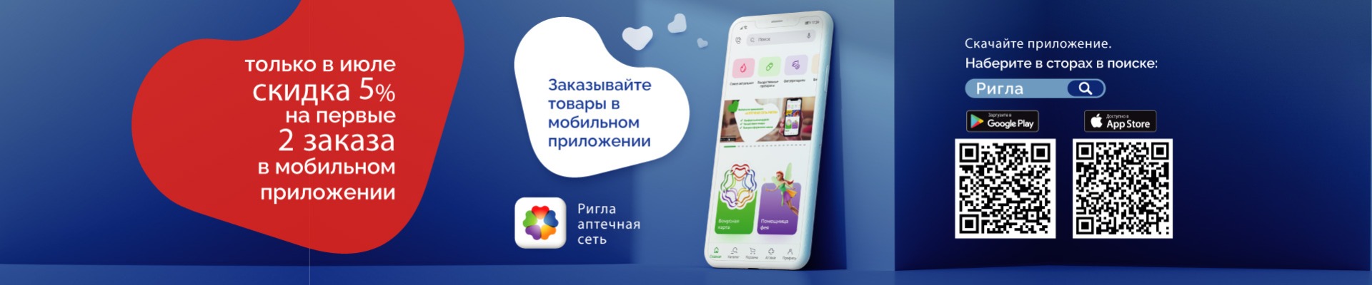 С 1 июля, 2020 г. по 31 июля, 2020 г. на первые два заказа, оформленные через мобильное приложение «Ригла» - скидка 5%!