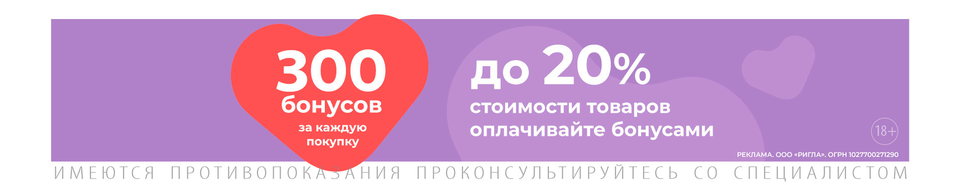 Акция проводится с 01 июня по 31 декабря 2023г. Только в аптеках Ригла Москвы и МО указанных на странице акции. Срок начисления бонусов индивидуален по каждой аптеке и указан на странице акции. При совершении покупки с использованием карты программы лояльности «Аптечная семья» однократно начисляется 300 бонусов, этими бонусами можно оплатить до 20% от стоимости товаров в течение 30 дней с момента начисления бонусов.