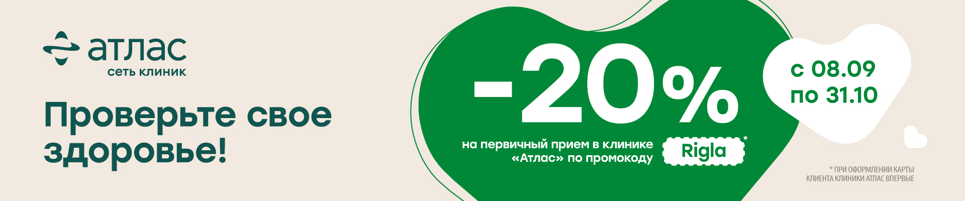 Скидка 20% на первичный прием врача в клинике «Атлас» по промокоду «Rigla», при оформлении карты клиента клиники впервые.