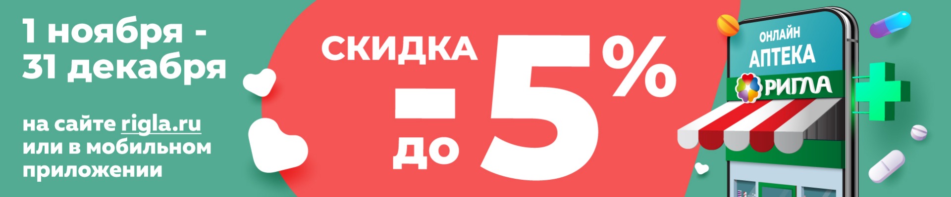 __________ Акция проводится с 1 ноября 2021 года по 31 декабря 2021 года на сайте www.rigla.ru и в мобильном приложении «Аптека Ригла» на территории Республики Бурятия. Скидка до 5% действует на весь ассортимент, кроме товаров Аллокин-Альфа лиоф. д/р-ра для п/к введ. 1мг №3, Аллокин-Альфа лиоф. д/р-ра для п/к введ. 1мг №6, Аллокин-альфа пор.д/ин. 1мг №3, Арепливир таб.п/о плен. 200мг №40, Оптинол Глубокое увлажнение 0,4% 10мл, Оптинол Мягкое восстановление 10мл, Оптинол Экспресс увлажнение 0,21% 10мл, Ригла маска медицинская трехслойная одноразовая №5, Ферстэйд маска медицинская №5, а также товаров по акциям «Товар дня», «Стоп цена» и товаров по специальному предложению. Скидка будет применена в корзине при оформлении заказа. Организатор акции – ООО «Ригла», ИНН 7724211288. Организатор акции вправе вносить изменения в условия акции и отменить акцию без предварительного уведомления. Подробности акции уточняйте на сайте www.rigla.ru и по телефону 8-800-777-03-03.