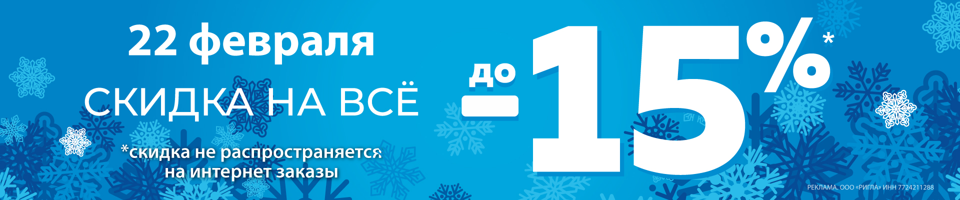 Акция проводится 22 февраля 2023 года в аптеках "Ригла" на территории Республики Татарстан по адресу: г.Казань, пл. Победы, д.91 (Гипермаркет АШАН) и Чувашской республики, г. Чебоксары, пр-т Ленина д.21. Скидка до 15% предоставляется на весь ассортимент, кроме товаров по акциям «Товар дня» и «Стоп Цена», а также товаров Аллокин-Альфа лиоф. д/р-ра для п/к введ. 1мг №3, Аллокин-Альфа лиоф. д/р-ра для п/к введ. 1мг №6, АЛМАГ +, Арепливир таб.п/о плен. 200мг №40, Оптинол Глубокое увлажнение 0,4% 10мл, Оптинол Мягкое восстановление 10мл, Оптинол Экспресс увлажнение 0,21% 10мл, Ригла маска медицинская трехслойная одноразовая №5, Ферстэйд маска медицинская №5. Акции не суммируются. На товары, приобретенные по акции, дополнительные скидки не действуют. Если товар участвует в нескольких акциях со скидками, то применяется наибольшая скидка в рублях. Скидка не действует на интернет заказ. Организатор акции – ООО «Ригла», ИНН 7724211288. Организатор акции вправе вносить изменения в условия акции и отменить акцию без предварительного уведомления. Подробности акции уточняйте у сотрудников аптеки и по телефону 8-800-777-0303.