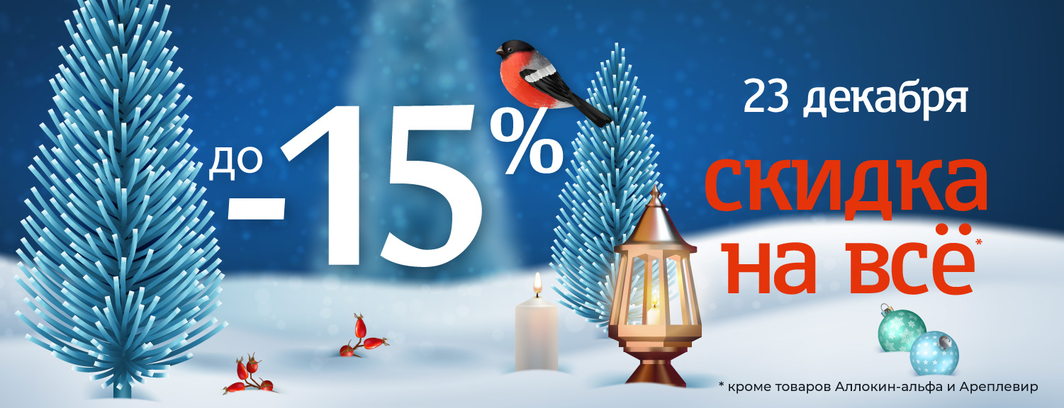 *Акция проводится 23 декабря, 2020 г. Скидка 15% предоставляется в аптеках «Ригла» Нижегородской области, Республики Марий Эл, Республики Татарстан, Чувашской Республики. Скидка распространяется на весь ассортимент, кроме товаров Аллокин-Альфа лиоф. д/р-ра для п/к введ. 1мг №3, Аллокин-Альфа лиоф. д/р-ра для п/к введ. 1мг №6, Арепливир таб.п/о плен. 200мг №40, Ригла маска медицинская трехслойная одноразовая №5, Ферстэйд маска медицинская №5. На товары, приобретенные по акции, дополнительные скидки не действуют. Если товар участвует в нескольких акциях со скидками, то применяется наибольшая скидка в рублях.
