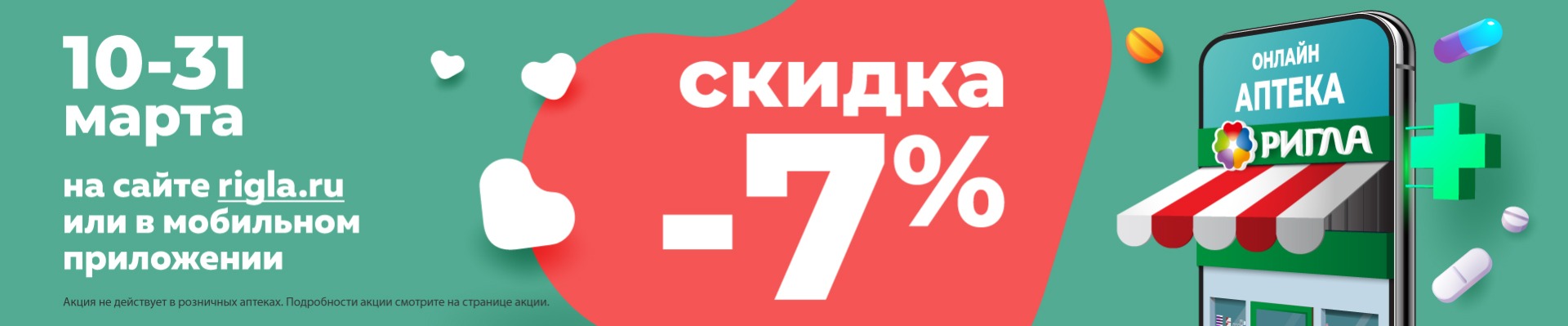 _____________ Акция проводится с 10.03.2021 по 31.03.2021 на сайте www.rigla.ru и в мобильном приложении «Аптека Ригла». Акция действует на территории Забайкальского края и г. Иркутск (Иркутская область). Скидка 7% предоставляется на весь ассортимент, кроме товаров Аллокин-Альфа лиоф. д/р-ра для п/к введ. 1мг №3, Аллокин-Альфа лиоф. д/р-ра для п/к введ. 1мг №6, Арепливир таб.п/о плен. 200мг №40, Ригла маска медицинская трехслойная одноразовая №5, Ферстэйд маска медицинская №5, а также товаров участвующих в акции Товар Дня и товаров по специальному предложению. Акции не суммируются. На товары, приобретенные по акции, дополнительные скидки не действуют. Если товар участвует в нескольких акциях со скидками, то применяется наибольшая скидка в рублях. Организатор акции – ООО «Ригла», ИНН 7724211288. Организатор акции вправе вносить изменения в условия акции и отменить акцию без предварительного уведомления. Подробности акции уточняйте на сайте www.rigla.ru и по телефону 8-800-777-03-03.
