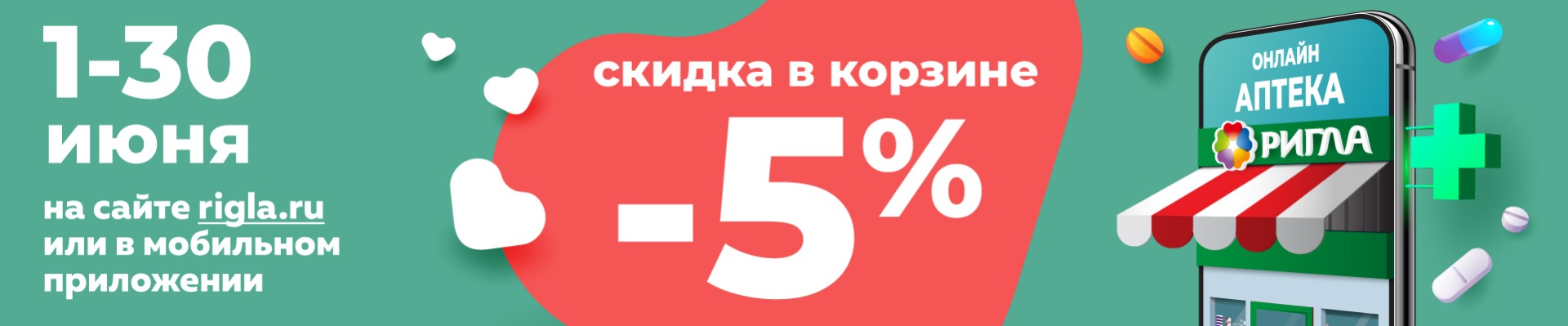 __________ Акция проводится с 1 июня 2021 года по 30 июня 2021 года на территории Забайкальского края и г. Улан-Удэ (Республика Бурятия). При заказе товаров на сайте www.rigla.ru и в мобильном приложении «Аптека Ригла», предоставляется скидка до 5%. Скидка будет применена и цена будет пересчитана в корзине при оформлении заказа. В акции участвует весь ассортимент, кроме товаров Аллокин-Альфа лиоф. д/р-ра для п/к введ. 1мг №3, Аллокин-Альфа лиоф. д/р-ра для п/к введ. 1мг №6, Арепливир таб.п/о плен. 200мг №40, Оптинол Глубокое увлажнение 0,4% 10мл, Оптинол Мягкое восстановление 10мл, Оптинол Экспресс увлажнение 0,21% 10мл, Ригла маска медицинская трехслойная одноразовая №5, Ферстэйд маска медицинская №5, а также товаров по акциям «Товар дня», «Стоп цена» и товаров по специальному предложению. Организатор акции – ООО «Ригла», ИНН 7724211288. Организатор акции вправе вносить изменения в условия акции и отменить акцию без предварительного уведомления. Подробности акции уточняйте на сайте www.rigla.ru и по телефону 8-800-777-03-03.