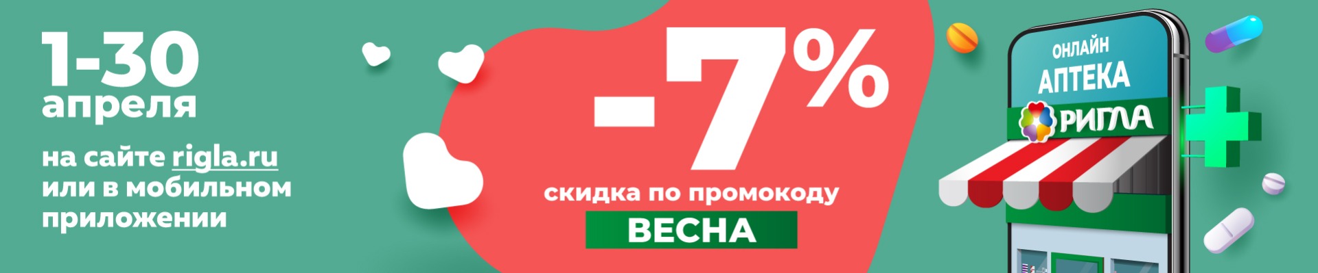 _____________ Акция проводится с 1 апреля 2021 года по 30 апреля 2021 года на территории Забайкальского края, Иркутской области и г. Улан-Удэ (Республика Бурятия). При заказе товаров на сайте www.rigla.ru и в мобильном приложении «Аптека Ригла», с указанием промокода «ВЕСНА», предоставляется скидка до 7%. В акции участвует весь ассортимент, кроме товаров Аллокин-Альфа лиоф. д/р-ра для п/к введ. 1мг №3, Аллокин-Альфа лиоф. д/р-ра для п/к введ. 1мг №6, Арепливир таб.п/о плен. 200мг №40, Оптинол Глубокое увлажнение 0,4% 10мл, Оптинол Мягкое восстановление 10мл, Оптинол Экспресс увлажнение 0,21% 10мл, Ригла маска медицинская трехслойная одноразовая №5, Ферстэйд маска медицинская №5, а также товаров по акциям «Товар дня» и товаров по специальному предложению. Организатор акции – ООО «Ригла», ИНН 7724211288. Организатор акции вправе вносить изменения в условия акции и отменить акцию без предварительного уведомления. Подробности акции уточняйте на сайте www.rigla.ru и по телефону 8-800-777-03-03.