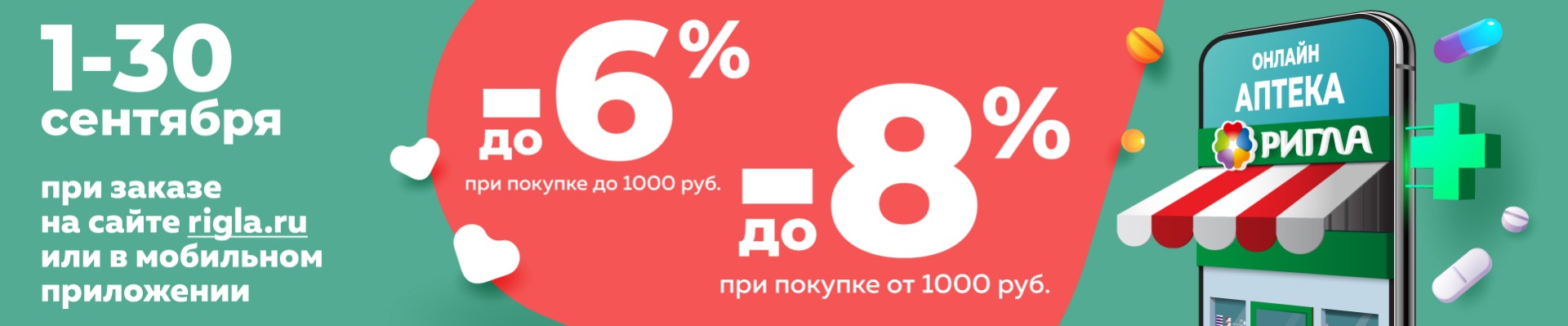 __________ Акция проводится с 1 сентября, 2021 года по 30 сентября, 2021 года на территории Иркутской области. При заказе товаров на сайте www.rigla.ru и в мобильном приложении «Аптека Ригла», на сумму до 999 руб. включительно предоставляется скидка до 6%. При заказе на сумму от 1000 руб. предоставляется скидка до 8%. Скидка предоставляется на весь ассортимент, кроме товаров Аллокин-Альфа лиоф. д/р-ра для п/к введ. 1мг №3, Аллокин-Альфа лиоф. д/р-ра для п/к введ. 1мг №6, Аллокин-альфа пор.д/ин. 1мг №3, Арепливир таб.п/о плен. 200мг №40, Оптинол Глубокое увлажнение 0,4% 10мл, Оптинол Мягкое восстановление 10мл, Оптинол Экспресс увлажнение 0,21% 10мл, Ригла маска медицинская трехслойная одноразовая №5, Ферстэйд маска медицинская №5, а также товаров по акциям «Товар дня», «Стоп цена» и товаров по специальному предложению. Организатор акции – ООО «Ригла», ИНН 7724211288. Организатор акции вправе вносить изменения в условия акции и отменить акцию без предварительного уведомления. Подробности акции уточняйте на сайте www.rigla.ru и по телефону 8-800-777-03-03.