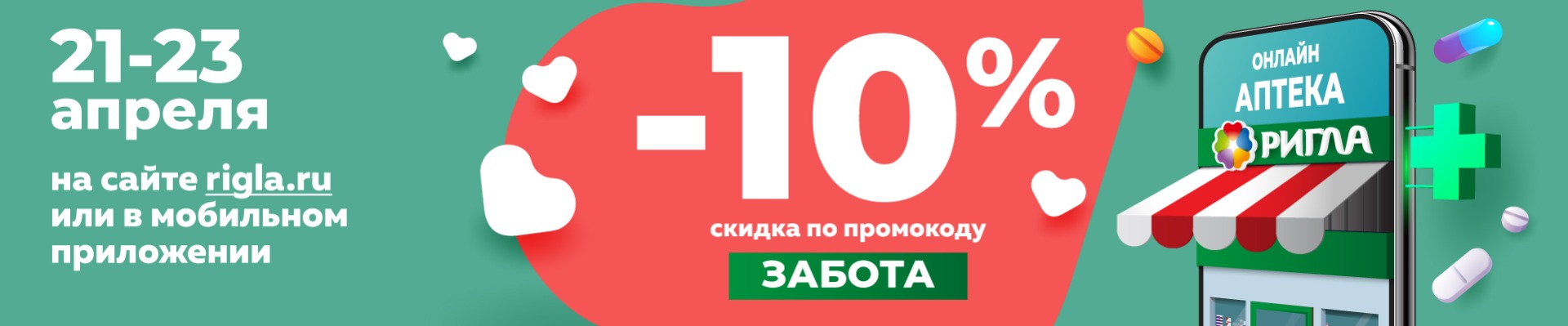 __________ Акция проводится с 21.04.2021 по 23.04.2021 на территории Калининградской области. При заказе товаров на сайте www.rigla.ru, в мобильном приложении «Аптека Ригла» или по телефону call-центра 8-800-777-03-03, с указанием промокода «ЗАБОТА» предоставляется скидка до 10% на весь ассортимент, кроме товаров Аллокин-Альфа лиоф. д/р-ра для п/к введ. 1мг №3, Аллокин-Альфа лиоф. д/р-ра для п/к введ. 1мг №6, Арепливир таб.п/о плен. 200мг №40, Ригла маска медицинская трехслойная одноразовая №5, Ферстэйд маска медицинская №5, Оптинол Экспресс увлажнение 0,21% 10мл, Оптинол Глубокое увлажнение 0,4% 10мл, Оптинол Мягкое восстановление 10 мл, а также товаров по специальному предложению. В течение акционного периода покупатель может использовать промокод неограниченное количество раз. Скидка рассчитывается на сайте, при оформлении заказа, после введения промо-кода «ЗАБОТА» в графу «промо-код». Акции не суммируются. На товары, приобретенные по данной акции, дополнительные скидки не действуют. Организатор акции – ООО «Ригла», ИНН 7724211288. Организатор акции вправе вносить изменения в условия акции и отменить акцию без предварительного уведомления. Подробности акции уточняйте на сайте www.rigla.ru и по телефону 8-800-777-03-03.