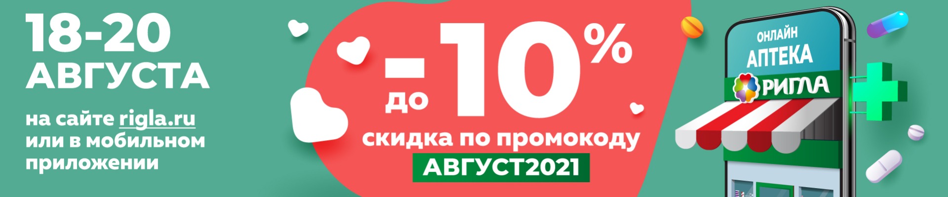 __________ Акция проводится с 18.08.2021 по 20.08.2021 на территории Калининградской области. При заказе товаров на сайте www.rigla.ru, в мобильном приложении «Аптека Ригла» и по телефону call-центра 8-800-777-03-03, с указанием промокода «АВГУСТ2021», предоставляется скидка до 10% на весь ассортимент, кроме товаров Аллокин-Альфа лиоф. д/р-ра для п/к введ. 1мг №3, Аллокин-Альфа лиоф. д/р-ра для п/к введ. 1мг №6, Аллокин-альфа пор.д/ин. 1мг №3, Арепливир таб.п/о плен. 200мг №40, Оптинол Глубокое увлажнение 0,4% 10мл, Оптинол Мягкое восстановление 10мл, Оптинол Экспресс увлажнение 0,21% 10мл, Ригла маска медицинская трехслойная одноразовая №5, Ферстэйд маска медицинская №5, и товаров по специальному предложению. В течение акционного периода покупатель может использовать промокод неограниченное количество раз. Скидка рассчитывается на сайте, при оформлении заказа, после введения промокода «АВГУСТ2021» в графу «промокод». Скидка не суммируется с другими акциями и предложениями. На товары, приобретенные по данной акции, дополнительные скидки не действуют. Организатор акции – ООО «Ригла», ИНН 7724211288. Организатор акции вправе вносить изменения в условия акции и отменить акцию без предварительного уведомления. Подробности акции уточняйте на сайте www.rigla.ru и по телефону 8-800-777-03-03.