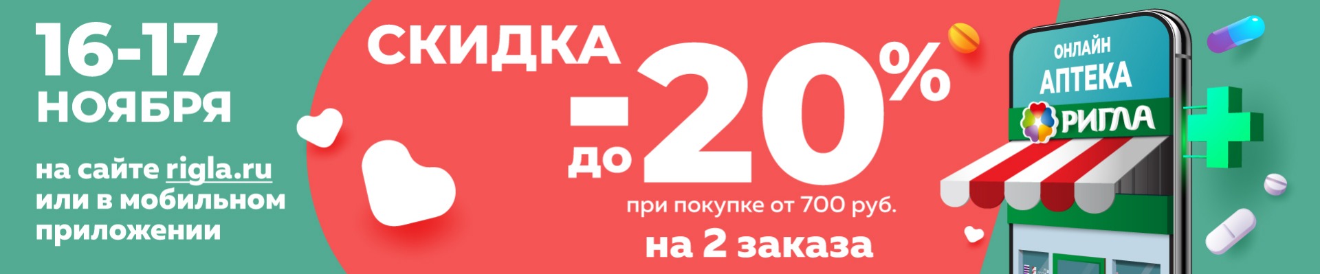 __________ Акция проводится с 16 ноября 2021 г. по 17 ноября 2021 г. на сайте www.rigla.ru и в мобильном приложении «Аптека Ригла» на территории Республики Карелия. Скидка до 20% предоставляется на заказы от 700 рублей, акция распространяется на 2 заказа. Скидка распространяется на весь ассортимент, кроме товаров Аллокин-Альфа лиоф. д/р-ра для п/к введ. 1мг №3, Аллокин-Альфа лиоф. д/р-ра для п/к введ. 1мг №6, Аллокин-альфа пор.д/ин. 1мг №3, Аппарат Алмаг магнитотерапевтический, Арепливир таб.п/о плен. 200мг №40, Оптинол Глубокое увлажнение 0,4% 10мл, Оптинол Мягкое восстановление 10мл, Оптинол Экспресс увлажнение 0,21% 10мл, Ригла маска медицинская трехслойная одноразовая №5, Ферстэйд маска медицинская №5, а также товаров по акции «Товар дня» и «Стоп цена». На товары, приобретенные по акции, дополнительные скидки не действуют. Организатор акции – ООО «Аптечная сеть О3», ИНН 7709068298. Организатор акции вправе вносить изменения в условия акции и отменить ее без предварительного уведомления. Подробные условия акции уточняйте на данной странице сайта www.rigla.ru.