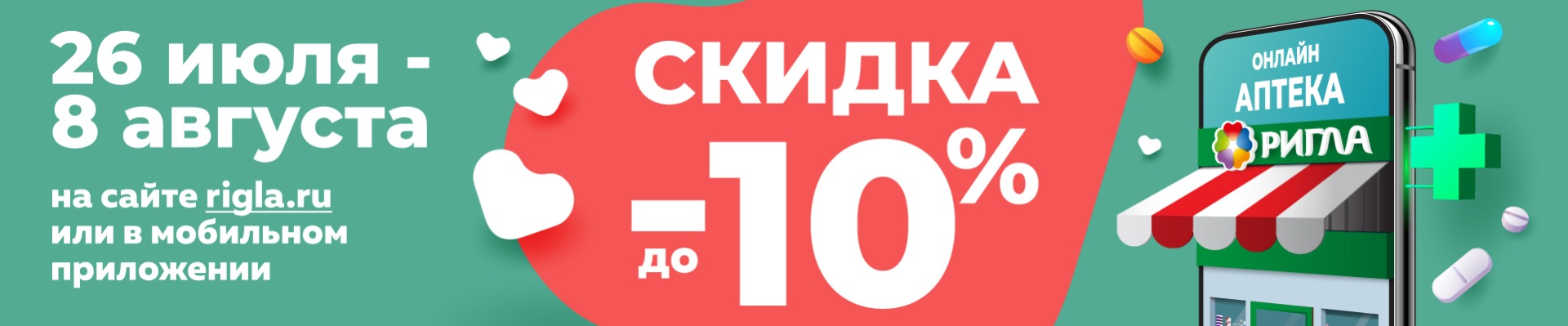 __________ Акция проводится с 26.07.2021 по 08.08.2021 на территории Краснодарского края. При заказе товаров на сайте www.rigla.ru, в мобильном приложении «Аптека Ригла» и по телефону call-центра 8-800-777-03-03 предоставляется скидка до 10% на весь ассортимент, кроме товаров Аллокин-Альфа лиоф. д/р-ра для п/к введ. 1мг №3, Аллокин-Альфа лиоф. д/р-ра для п/к введ. 1мг №6, Аллокин-альфа пор.д/ин. 1мг №3, Арепливир таб.п/о плен. 200мг №40, Оптинол Глубокое увлажнение 0,4% 10мл, Оптинол Мягкое восстановление 10мл, Оптинол Экспресс увлажнение 0,21% 10мл, Ригла маска медицинская трехслойная одноразовая №5, Ферстэйд маска медицинская №5, а также товаров по акциям «Товар дня», «Стоп цена» и товаров по специальному предложению. В течение акционного периода покупатель может воспользоваться скидкой неограниченное количество раз. Скидка рассчитывается в корзине при оформлении заказа. На товары, приобретенные по данной акции, дополнительные скидки не действуют. Организатор акции – ООО «Ригла», ИНН 7724211288. Организатор акции вправе вносить изменения в условия акции и отменить акцию без предварительного уведомления. Подробности акции уточняйте на сайте www.rigla.ru и по телефону 8-800-777-03-03.