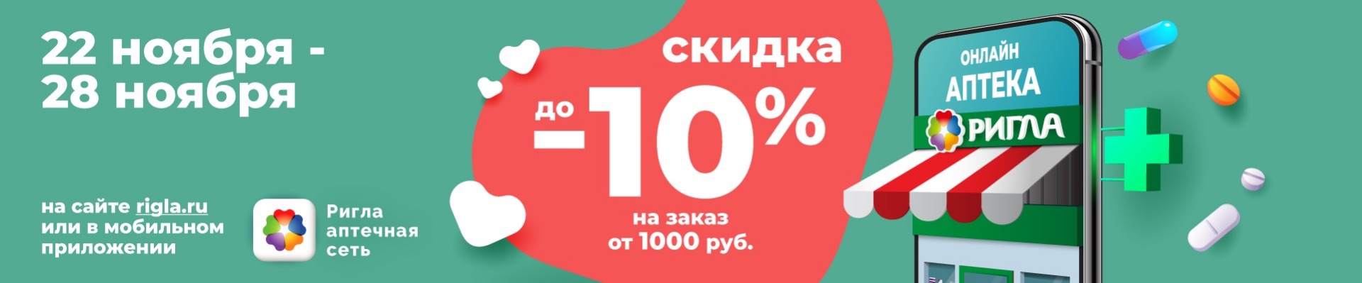 Акция проводится с 22.11.2021 по 28.11.2021 на сайте www.rigla.ru, в мобильном приложении «Аптека Ригла» на территории Краснодарского края. При заказе товаров скидка будет применена в корзине. Предоставляется скидка до 10% на заказы от 1000 рублей. Скидка распространяется на весь ассортимент, кроме товаров Аллокин-Альфа лиоф. д/р-ра для п/к введ. 1мг №3, Аллокин-Альфа лиоф. д/р-ра для п/к введ. 1мг №6, Аллокин-альфа пор.д/ин. 1мг №3, Арепливир таб.п/о плен. 200мг №40, Оптинол Глубокое увлажнение 0,4% 10мл, Оптинол Мягкое восстановление 10мл, Оптинол Экспресс увлажнение 0,21% 10мл, Ригла маска медицинская трехслойная одноразовая №5, Ферстэйд маска медицинская №5, а также товаров по акциям «Товар дня», «Стоп цена» и товаров по специальному предложению. Скидка будет применена неограниченное количество раз.На товары, приобретенные по данной акции, дополнительные скидки не действуют. Организатор акции – ООО «Ригла», ИНН 7724211288. Организатор акции вправе вносить изменения в условия акции и отменить акцию без предварительного уведомления. Подробности акции уточняйте на данной странице сайта www.rigla.ru и по телефону 8-800-777-03-03.