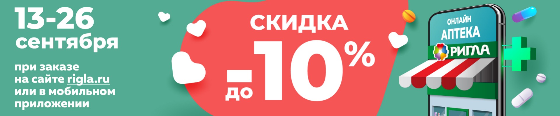 __________ Акция проводится с 13.09.2021 по 26.09.2021 на территории Краснодарского края. При заказе товаров на сайте www.rigla.ru и в мобильном приложении «Аптека Ригла» предоставляется скидка до 10% на весь ассортимент, кроме товаров Аллокин-Альфа лиоф. д/р-ра для п/к введ. 1мг №3, Аллокин-Альфа лиоф. д/р-ра для п/к введ. 1мг №6, Аллокин-альфа пор.д/ин. 1мг №3, Арепливир таб.п/о плен. 200мг №40, Коронавир таб.п/о плен. 200мг №50, Оптинол Глубокое увлажнение 0,4% 10мл, Оптинол Мягкое восстановление 10мл, Оптинол Экспресс увлажнение 0,21% 10мл, Ригла маска медицинская трехслойная одноразовая №5, Ферстэйд маска медицинская №5, а также товаров по акциям «Товар дня», «Стоп цена» и товаров по специальному предложению. Скидка будет применена неограниченное количество раз. Цена будет пересчитана при оформлении заказа. На товары, приобретенные по данной акции, дополнительные скидки не действуют. Организатор акции – ООО «Ригла», ИНН 7724211288. Организатор акции вправе вносить изменения в условия акции и отменить акцию без предварительного уведомления. Подробности акции уточняйте на сайте www.rigla.ru и по телефону 8-800-777-03-03.