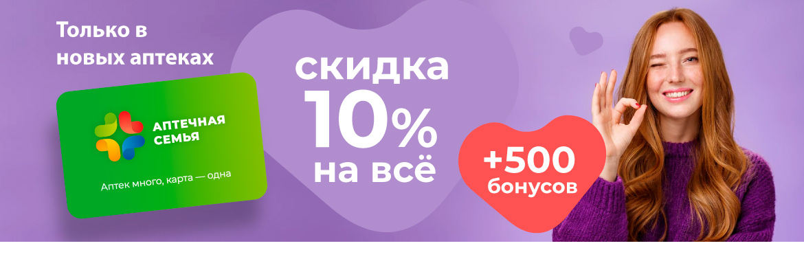 При совершении покупки с использованием карты программы лояльности «Аптечная семья» предоставляется скидка в размере 10% и начисляется 500 бонусов, этими бонусами можно оплатить до 20% от стоимости товаров в течение 30 дней с момента начисления бонусов. Предоставление скидки и начисление бонусов производится только на одну покупку в течение срока акции. Акция действует на весь ассортимент, кроме товаров: Аллокин-альфа лиоф. Д/р-ра для п/к введ. 1мг №3; Аллокин-альфа лиоф. Д/р-ра для п/к введ. 1мг №6; Аллокин-альфа пор.д/ин. 1мг №3; Оптинол экспресс увлажнение 0,21% 10мл; Оптинол глубокое увлажнение 0,4% 10мл; Оптинол мягкое восстановление 10мл, а также товары по акциям «Товар дня» и «Стоп цена».