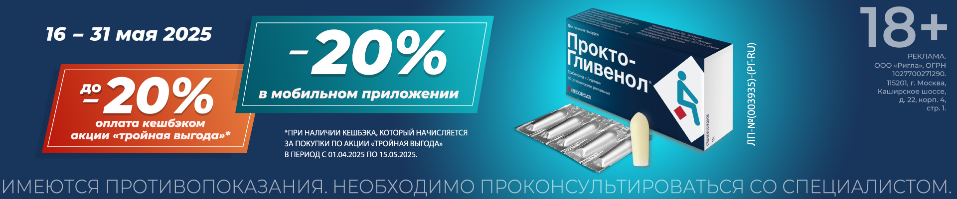 *Срок проведения акции с 16 мая по 31 мая 2025 г. Организатор акции – ООО «Ригла», ИНН 7724211288. Акция действует на выделенный ассортимент в мобильном приложении. Скидка по акции суммируется с кешбэк-бонусами за покупку товара по акции «Тройная выгода» в период с 01.04.2025 по 15.05.2025. Организатор акции вправе вносить изменения в условия акции в одностороннем порядке без предварительного уведомления. Организатор акции не гарантирует постоянное наличие полного акционного ассортимента в течение всего периода проведения акции. Наличие акционного товара в аптеках уточняйте у сотрудников аптек или по телефону 8-800-777-0303.