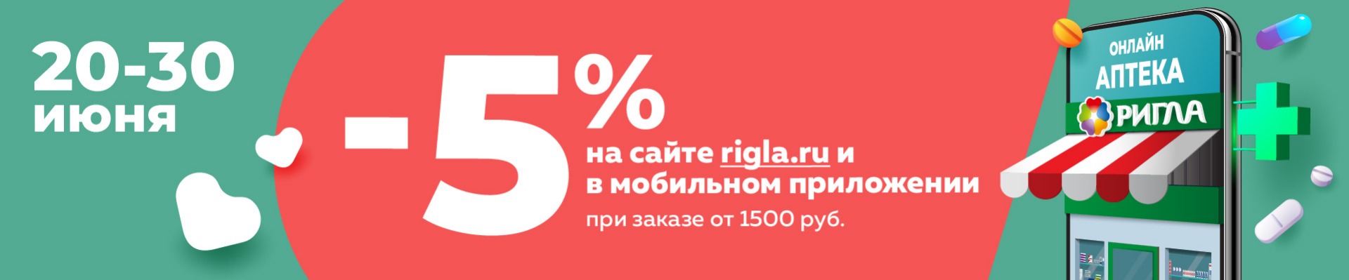 __________ Акция проходит с 20 июня 2022 г. по 30 июня 2022 года на сайте www.rigla.ru и в мобильном приложении «Аптека Ригла» на территории Республики Адыгея, Республики Крым, Краснодарского края, Ростовской области, г. Севастополя. Скидка 5 % предоставляется на интернет-заказ на сумму от 1500 руб. В акции участвует весь ассортимент, кроме товаров Аллокин- Альфа лиоф. д/р-ра для п/к введ. 1 мг №3, Аллокин-Альфа лиоф. д/р-ра для п/к введ. 1 мг № 6, Арепливир таб. п/о плен. 200 мг№40. На товары, приобретенные по акции, дополнительные скидки не действуют, кроме начисления и списания бонусов по программе лояльности «Аптечная семья». Скидки аптек не действуют. Организатор акции ООО «Будь Здоров!», ИНН 6164202134, ОГРН 1026103276000. Организатор акции вправе вносить изменения в условия акции и отменить ее без предварительного уведомления. Подробности акции уточняйте у сотрудников аптеки или по телефону 8( 863) 254-35-44 ( время звонков пн.-пят. С 10-00 до 17-00). ИМЕЮТСЯ ПРОТИВОПОКАЗАНИЯ. НЕОБХОДИМО ПРОКОНСУЛЬТИРОВАТЬСЯ С ВРАЧОМ. 18+
