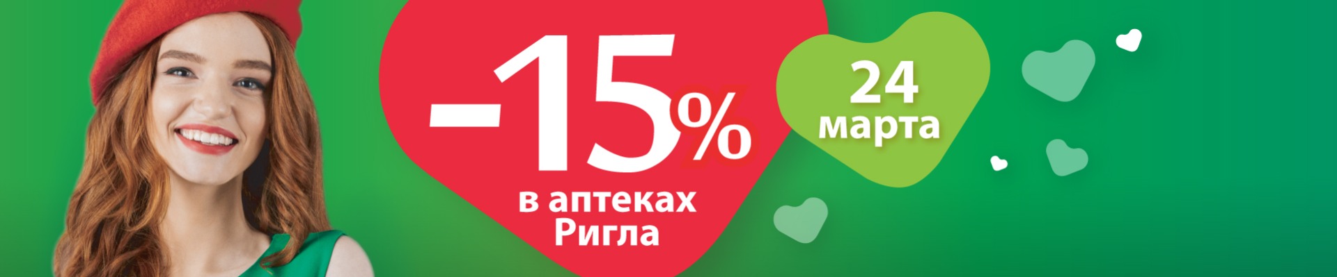 Акция проводится 24 марта 2021 г. в аптеках «Ригла», указанных на сайте www.rigla.ru, в Ростовской области, республике Крым и г. Севастополе. В круглосуточных аптеках акция действует с 7:00 до 24:00. Скидка 15% распространяется на весь ассортимент, кроме товаров Аллокин-Альфа лиоф. д/р-ра для п/к введ. 1мг №3, Аллокин-Альфа лиоф. д/р-ра для п/к введ. 1мг №6, Арепливир таб.п/о плен. 200мг №40, Ригла маска медицинская трехслойная одноразовая №5, Ферстэйд маска медицинская №5, Коронавир таб.п/о плен. 200мг №50, а также товаров, участвующих в акциях «Товар дня» и «Стоп-цена». На товары, приобретенные по акции, дополнительные скидки не действуют. Если товар участвует в нескольких акциях со скидками, то применяется наибольшая скидка в рублях. Организатор акции – ООО «Будь здоров!», ИНН 6164202134. Организатор акции вправе вносить изменения в условия акции или отменить акцию без предварительного уведомления. Подробности акции и полный список аптек, участвующих в акции, уточняйте на сайте www.rigla.ru и по телефону 8 (863) 254-19-08. На заказы на сайте www.rigla.ru и в мобильном приложении «Аптека Ригла» акция не распространяется.