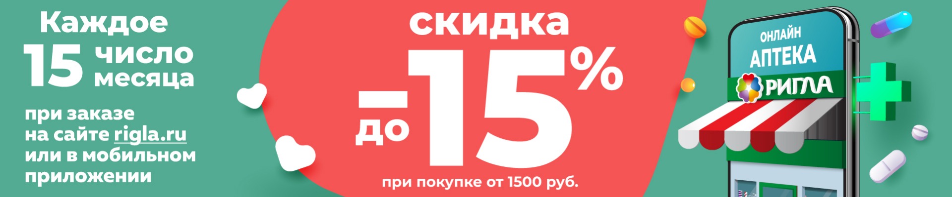 __________ Акция проводится с 15 сентября, 2021 года по 15 января, 2022 года в Республике Крым , Ростовской области, г. Севастополь. Каждого 15 числа каждого месяца в период акции, на сайте www.rigla.ru и в мобильном приложении «Аптека Ригла» предоставляется скидка 15% на заказы от 1500 рублей. Скидка распространяется на весь ассортимент, кроме товаров Аллокин-Альфа лиоф. д/р-ра для п/к введ. 1мг №3, Аллокин-Альфа лиоф. д/р-ра для п/к введ. 1мг №6, Аллокин-Альфа пор.д/ин 1мг №3, Арепливир таб.п/о плен. 200мг №40, Ригла маска медицинская трехслойная одноразовая №5, Ферстэйд маска медицинская №5, Оптинол Экспресс увл 0,21% 10мл, Оптинол Глубокое увл 0,4% 10мл, Оптинол Мягкое восстановление 10мл. На товары, приобретенные по акции, дополнительные скидки не действуют, кроме начисления и списания бонусов по программе лояльности «пРИГЛАшаем». Организатор акции ООО «Будь Здоров!», ИНН 6164202134, ОГРН 1026103276000. Организатор акции вправе вносить изменения в условия акции и отменить ее без предварительного уведомления. Подробности акции, уточняйте у сотрудников аптеки или по телефону 8 (800) 777-03-03. ИМЕЮТСЯ ПРОТИВОПОКАЗАНИЯ. НЕОБХОДИМО ПРОКОНСУЛЬТИРОВАТЬСЯ С ВРАЧОМ. 18+