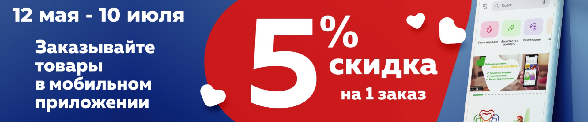 __________ Акция проводится с 12.05.2021 по 10.07.2021 на территории Республики Крым и г. Севастополь. Акция доступна только авторизованным пользователям. Предоставляется скидка до 5% на 1 заказ через мобильное приложение ООО «Аптека Ригла». Скидка рассчитывается на сайте, при оформлении заказа. В акции участвует весь ассортимент, кроме товаров Аллокин-Альфа лиоф. д/р-ра для п/к введ. 1мг №3, Аллокин-Альфа лиоф. д/р-ра для п/к введ. 1мг №6, Арепливир таб.п/о плен. 200мг №40, Оптинол Глубокое увлажнение 0,4% 10мл, Оптинол Мягкое восстановление 10мл, Оптинол Экспресс увлажнение 0,21% 10мл, Ригла маска медицинская трехслойная одноразовая №5, Ферстэйд маска медицинская №5, а также товаров по специальному предложению. Организатор акции – ООО ООО «Ригла», ИНН 7724211288. Организатор акции вправе вносить изменения в условия акции и отменить акцию без предварительного уведомления. Подробности акции уточняйте на сайте www.rigla.ru и у сотрудников аптек.