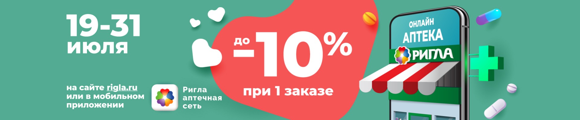 __________ Акция проводится с 19 июля 2021 года по 31 июля 2021 года на территории Владимирской, Липецкой, Рязанской и Тульской областей. Предоставляется скидка до 10% на 1 заказ при покупке через мобильное приложение «Аптека Ригла» или на сайте www.rigla.ru. В акции участвует весь ассортимент, кроме товаров Аллокин-Альфа лиоф. д/р-ра для п/к введ. 1мг №3, Аллокин-Альфа лиоф. д/р-ра для п/к введ. 1мг №6, Аллокин-альфа пор.д/ин. 1мг №3, Алмаг аппарат плюс магнитотерапевтический с пренадлежностями, Алмаг Диамаг Алмaг-03 аппарат магнитотерапевтический, Аппарат Алмаг-01 магнитотерапевтический, Аппарат Алмаг-02 магнитотерапевтический исполнение 2, Аппарат МАГ-30 магнитотерапевтический низкочастотный портативный, Аппарат УЛП-01 Елат, Арепливир таб.п/о плен. 200мг №40, Дезар-4 ОРУБп-3-3-КРОНТ, Доктор ТЭС-03 электростимулятор транскраниальный импульсный биполярный, Мультилор вар.пост. №3, Оптинол Глубокое увлажнение 0,4% 10мл, Оптинол Мягкое восстановление 10мл, Оптинол Экспресс увлажнение 0,21% 10мл, Ригла маска медицинская трехслойная одноразовая №5, Унилор-01 устройство д/локальной/комплексной терапии, Устройство Мавит АЛП-01 ПРА, Устройство Теплон УЛЧТ-02 Елат с облучателем, Устройство УТМпк-01 Пара термомагнитное, Устройство УТМпк-01 Пара термомагнитное, Устройство Фея УТЛ-01 Елат д/лечения пазух носа/гортани, Устройство Фея УТЛ-01 Елат д/лечения пазух носа/гортани, Ферстэйд маска медицинская №5, Электростимулятор СТИМЭЛ-01, а также товаров по акциям «Товар дня», «Стоп цена» и товаров по специальному предложению. Акции не суммируются. На товары, приобретенные по данной акции, дополнительные скидки не действуют. Организатор акции – ООО «Ригла», ИНН 7724211288. Организатор акции вправе вносить изменения в условия акции и отменить акцию без предварительного уведомления. Подробности акции уточняйте на сайте www.rigla.ru и по телефону 8-800-777-03-03.