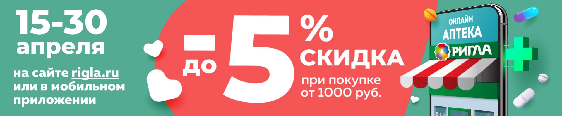 Акция проводится с 15.04.2022 по 30.04.2022 в мобильном приложении «Аптека Ригла» и на сайте www.rigla.ru. На интернет-заказ на сумму 1000 руб. и более предоставляется скидка 5%. Акция действует на территории г. Самары, Новокуйбышевска, Тольятти, Нефтегорска. Скидка предоставляется на весь ассортимент, кроме товаров Аллокин-Альфа лиоф. д/р-ра для п/к введ. 1мг №3, Аллокин-Альфа лиоф. д/р-ра для п/к введ. 1мг №6, Арепливир таб.п/о плен. 200мг №40, Ригла маска медицинская трехслойная одноразовая №5, Ферстэйд маска медицинская №5. Акции не суммируются. На товары, приобретенные по акции, дополнительные скидки не действуют. Организатор акции ООО «Ригла» Самарский филиал, ИНН 7724211288 Организатор акции вправе вносить изменения в условия акции и отменить акцию без предварительного уведомления. Подробности акции уточняйте на сайте www.rigla.ru.