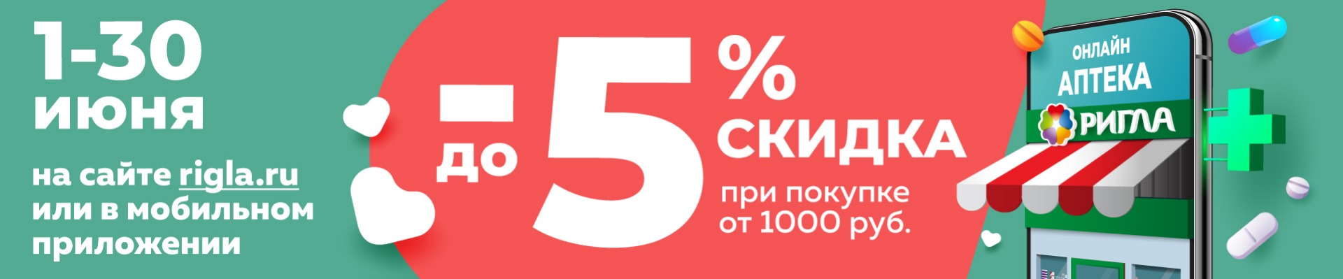 Акция проводится с 1 июня 2022 г. по 30 июня 2022 г. при заказе товаров на сумму от 1000 руб. на сайте www.rigla.ru и в мобильном приложении «Аптека Ригла» на территории Самарской области предоставляется скидка 5%. Скидка предоставляется на весь ассортимент, кроме товаров Аллокин-Альфа лиоф. д/р-ра для п/к введ. 1мг №3, Аллокин-Альфа лиоф. д/р-ра для п/к введ. 1мг №6, Арепливир таб.п/о плен. 200мг №40, Оптинол Глубокое увлажнение 0,4% 10мл, Оптинол Мягкое восстановление 10мл, Оптинол Экспресс увлажнение 0,21% 10мл, Ригла маска медицинская трехслойная одноразовая №5, Ферстэйд маска медицинская №5, а также товаров по акциям «Товар дня», «Стоп цена» и товаров по специальному предложению. Организатор акции – ООО «Ригла», ИНН 7724211288. Организатор акции вправе вносить изменения в условия акции и отменить акцию без предварительного уведомления. Подробности акции уточняйте на сайте www.rigla.ru и по телефону 8-800-777-03-03.