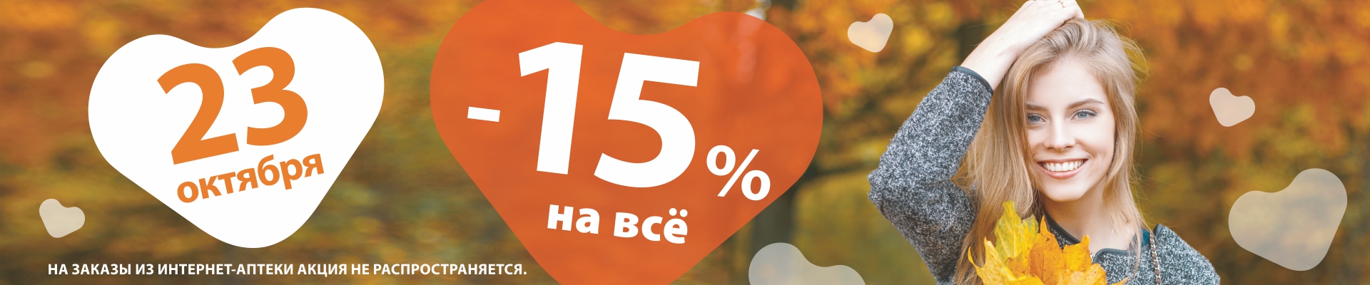 Акция «Скидка 15% на все» действует 23 октября 2019 г. в аптеках «РИГЛА» в Краснодарском крае. Скидка распространяется на весь ассортимент. На товары, приобретенные по акции, дополнительные скидки не действуют, кроме начисления и списания бонусов по программе лояльности «пРИГЛАшаем» и «Спасибо от Сбербанка». Если товар участвует в нескольких акциях со скидками, то применяется наибольшая из возможных скидок.