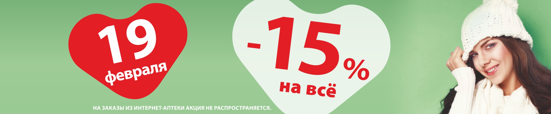 Акция скидка 15% действует 19 февраля 2020 г. в аптеках «Ригла» в Краснодарском крае.