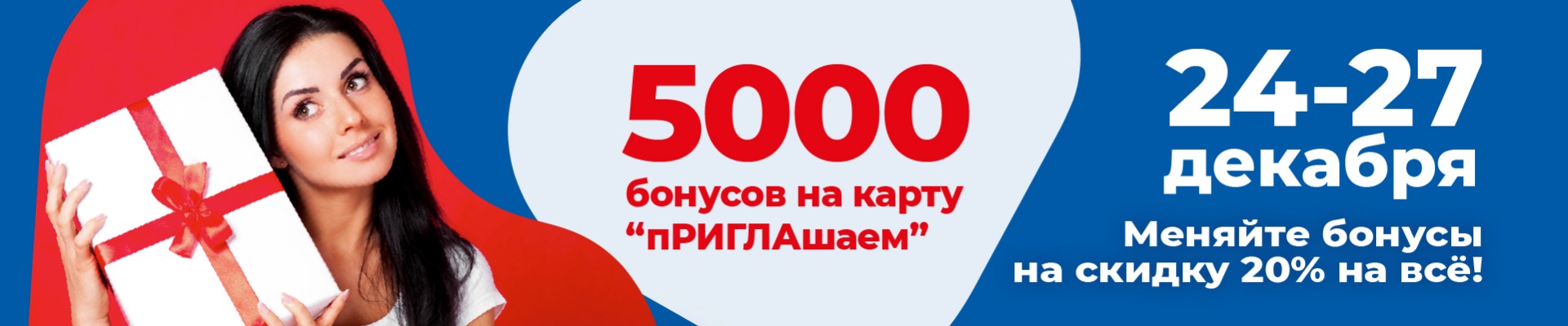 На карты лояльности «пРИГЛАшаем», активированные до 23 декабря 2020 включительно предначисляются 5000 бонусов, этими бонусами можно оплатить 20% от стоимости любых товаров, *кроме Аллокин-Альфа лиоф. д/р-ра для п/к введ. 1мг №3, Аллокин-Альфа лиоф. д/р-ра для п/к введ. 1мг №6, Арепливир таб.п/о плен. 200мг №40, Ригла маска медицинская трехслойная одноразовая №5, Ферстэйд маска медицинская №5, Алмаг аппарат плюс магнитотерапевтический с пренадлежностями.