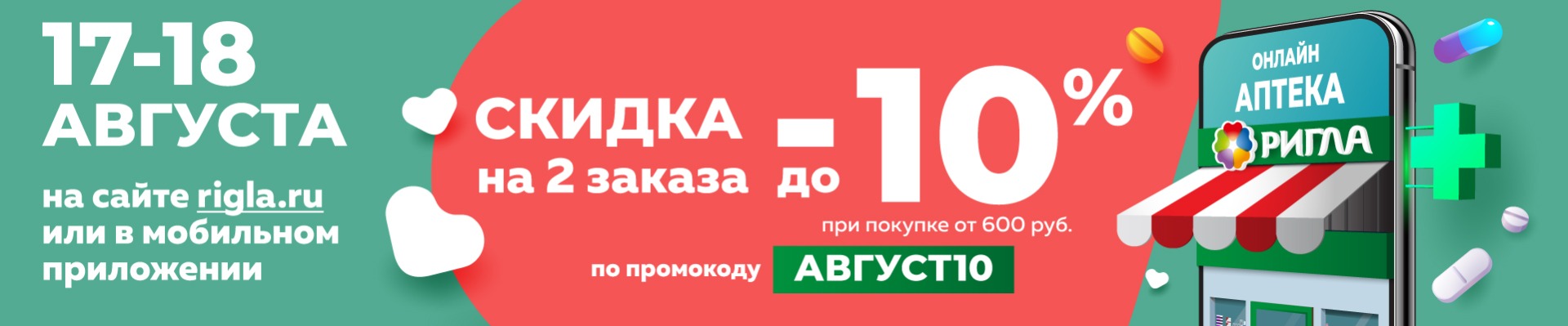 __________ Акция проводится с 17 августа 2021 года по 18 августа 2021 года на территории Новгородской и Псковской области. При заказе от 600 рублей через мобильное приложение «Аптека Ригла» или на сайте www.rigla.ru и при использовании промокода «АВГУСТ10» предоставляется скидка до 10 %. За акционный период промокодом можно воспользоваться 2 раза. Акция распространяется только на онлайн заказы и доступна только зарегистрированным пользователям. Скидка рассчитывается на сайте, при оформлении заказа, после введения промокода «АВГУСТ10» в поле «Промокод». Скидка распространяется на весь ассортимент, кроме товаров Аллокин-Альфа лиоф. д/р-ра для п/к введ. 1мг №3, Аллокин-Альфа лиоф. д/р-ра для п/к введ. 1мг №6, Аллокин-альфа пор.д/ин. 1мг №3, Арепливир таб.п/о плен. 200мг №40, Оптинол Глубокое увлажнение 0,4% 10мл, Оптинол Мягкое восстановление 10мл, Оптинол Экспресс увлажнение 0,21% 10мл, Ригла маска медицинская трехслойная одноразовая №5, Ферстэйд маска медицинская №5, Аппарат Алмаг-02 магнитотерапевтический исполнение 1, Аппарат Алмаг-01 магнит терапевтический, Апарат Алмаг-02 магнитотерапевтический исполнение 2, а также товаров по акциям «Товар дня», «Стоп цена» и по специальному предложению. На товары, приобретенные по акции, дополнительные скидки не действуют. Организатор акции – ООО «Фармацевтическое предприятие «ПАНАЦЕЯ», ИНН 4714024477. Организатор акции вправе вносить изменения в условия акции и отменить ее без предварительного уведомления. Подробные условия акции уточняйте у сотрудников аптек и на сайте www.rigla.ru.