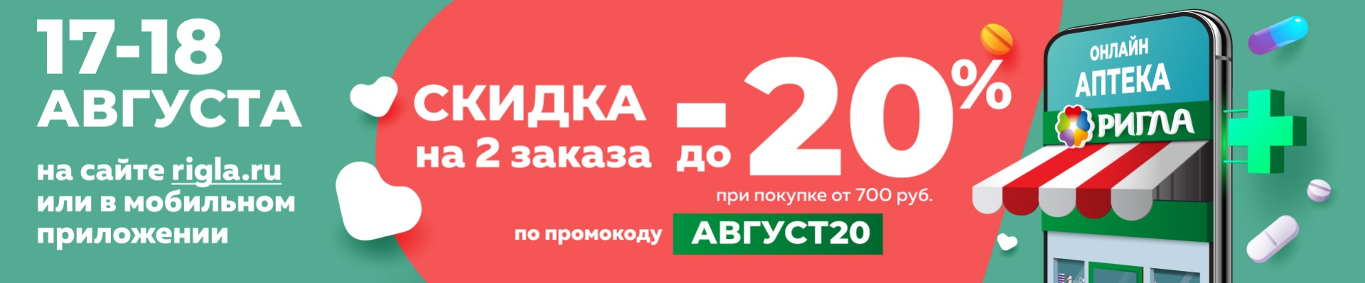 __________ Акция проводится с 17 августа 2021 года по 18 августа 2021 года на территории Санкт-Петербурга, Ленинградской области, Республики Карелия. При заказе от 700 рублей через мобильное приложение «Аптека Ригла» или на сайте www.rigla.ru и при использовании промокода «АВГУСТ20» предоставляется скидка 20 %. За акционный период промокодом можно воспользоваться 2 раза. Акция распространяется только на онлайн заказы и доступна только зарегистрированным пользователям. Скидка рассчитывается на сайте при оформлении заказа после введения промокода «АВГУСТ20» в поле «Промокод». Скидка распространяется на весь ассортимент, кроме товаров Аллокин-Альфа лиоф. д/р-ра для п/к введ. 1мг №3, Аллокин-Альфа лиоф. д/р-ра для п/к введ. 1мг №6, Аллокин-альфа пор.д/ин. 1мг №3, Арепливир таб.п/о плен. 200мг №40, Оптинол Глубокое увлажнение 0,4% 10мл, Оптинол Мягкое восстановление 10мл, Оптинол Экспресс увлажнение 0,21% 10мл, Ригла маска медицинская трехслойная одноразовая №5, Ферстэйд маска медицинская №5, Аппарат Алмаг-02 магнитотерапевтический исполнение 1, Аппарат Алмаг-01 магнит терапевтический, Апарат Алмаг-02 магнитотерапевтический исполнение 2, а также товаров по акциям «Товар дня», «Стоп цена» и по специальному предложению. На товары, приобретенные по акции, дополнительные скидки не действуют. Организатор акции – ООО «Фармацевтическое предприятие «ПАНАЦЕЯ», ИНН 4714024477. Организатор акции вправе вносить изменения в условия акции и отменить ее без предварительного уведомления. Подробные условия акции уточняйте у сотрудников аптек и на сайте www.rigla.ru.