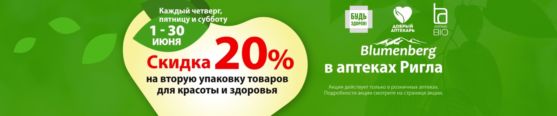 С 01 по 30 июня 2021 г. каждый четверг, пятницу и субботу действует скидка 20 % на второй товар торговых марок Будь Здоров, Добрый Аптекарь, Aroma BIO, Blumenberg.