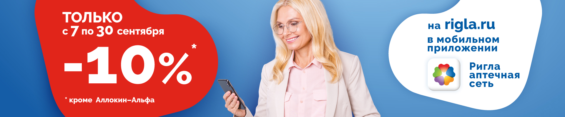 Только с 7 по 30 сентября 2020г. скидка 10% весь ассортимент* на rigla.ru и в мобильном приложении Ригла аптечная сеть.