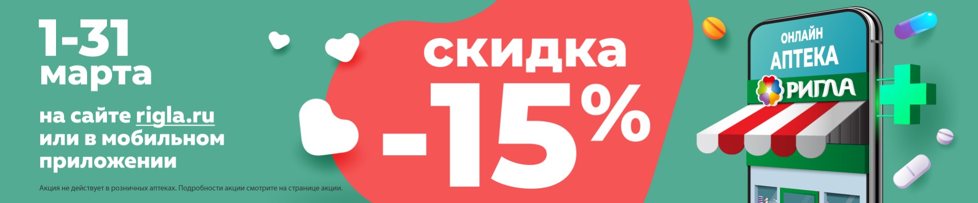 _____________ Акция проводится с 01 марта, 2021 г. по 31 марта, 2021 г. в интернет-аптеке «Ригла» и в мобильном приложении «Ригла аптечная сеть» Республики Коми. Скидка 15% предоставляется на все товары, кроме товаров-исключений, представленных на данной странице. Дополнительные скидки на данное предложение не действуют. Акции не суммируются. Организатор акции – ООО «Ригла», ИНН 7724211288. Организатор акции вправе вносить изменения в условия акции или отменить акцию без предварительного уведомления. Подробности акции уточняйте на сайте www.rigla.ru.