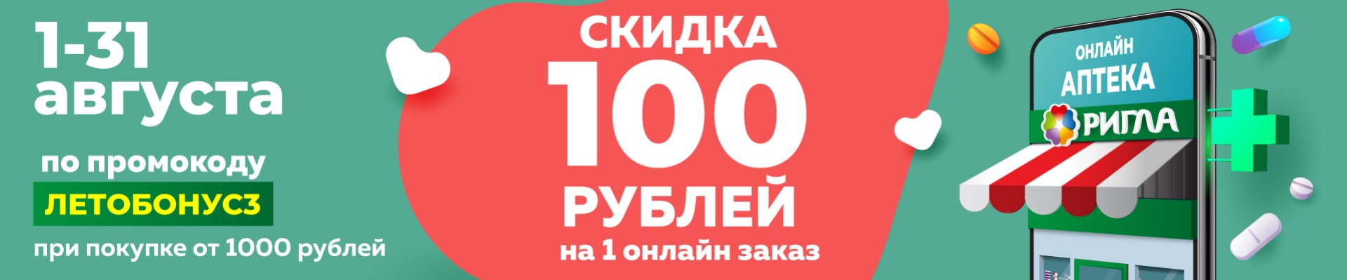 __________ Акция проводится с 01.08.2021 по 31.08.2021 на территории Архангельской области и в Республике Коми. Акция доступна только зарегистрированным пользователям. При заказе товаров на сумму от 1000 рублей на сайте www.rigla.ru или в мобильном приложении «Аптека Ригла», с указанием промокода «ЛЕТОБОНУС3», предоставляется скидка 100 рублей. Данным промокодом можно воспользоваться 1 раз в течение акционного периода. В акции участвует весь ассортимент, кроме товаров Аллокин-Альфа лиоф. д/р-ра для п/к введ. 1мг №3, Аллокин-Альфа лиоф. д/р-ра для п/к введ. 1мг №6, Арепливир таб.п/о плен. 200мг №40, Оптинол Глубокое увлажнение 0,4% 10мл, Оптинол Мягкое восстановление 10мл, Оптинол Экспресс увлажнение 0,21% 10мл, Ригла маска медицинская трехслойная одноразовая №5, Ферстэйд маска медицинская №5, а также товаров по акциям «Товар дня» и «Стоп цена» и товаров по специальному предложению. Подробности акции уточните у фармацевта и по тел. 8 (800) 777-03-03. Акции не суммируются. На товары, приобретенные по акции, дополнительные скидки не действуют. Организатор акции – ООО «Ригла», ИНН 7724211288. Организатор акции вправе вносить изменения в условия акции и отменить акцию без предварительного уведомления. Подробности акции уточняйте на сайте www.rigla.ru.