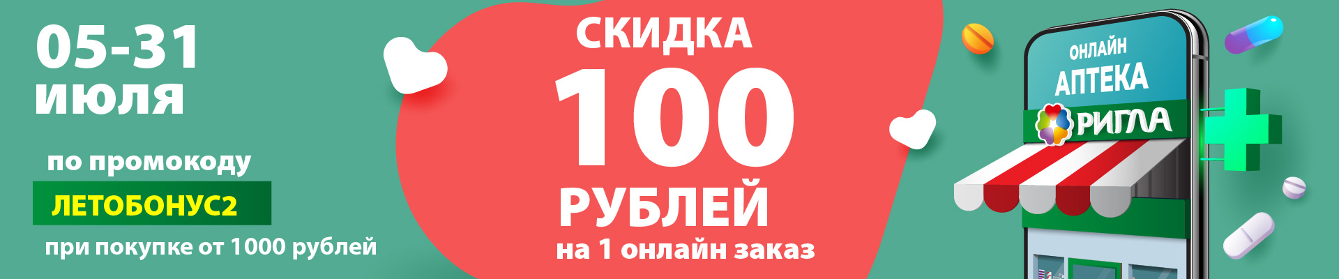 __________ Акция проводится с 05.07.2021 по 31.07.2021 на территории Архангельской области и в республике Коми. Акция доступна только зарегистрированным пользователям. При заказе товаров на сумму от 1000 рублей на сайте www.rigla.ru или в мобильном приложении «Аптека Ригла», с указанием промокода «ЛЕТОБОНУС2», предоставляется скидка 100 рублей. Данным промокодом можно воспользоваться 1 раз в течение акционного периода. В акции участвует весь ассортимент, кроме товаров Аллокин-Альфа лиоф. д/р-ра для п/к введ. 1мг №3, Аллокин-Альфа лиоф. д/р-ра для п/к введ. 1мг №6, Арепливир таб.п/о плен. 200мг №40, Оптинол Глубокое увлажнение 0,4% 10мл, Оптинол Мягкое восстановление 10мл, Оптинол Экспресс увлажнение 0,21% 10мл, Ригла маска медицинская трехслойная одноразовая №5, Ферстэйд маска медицинская №5, а также товаров по акциям «Товар дня» и «Стоп цена» и товаров по специальному предложению. Подробности акции уточните у фармацевта и по тел. 8 (800) 777-03-03. Акции не суммируются. На товары, приобретенные по акции, дополнительные скидки не действуют. Организатор акции – ООО «Ригла», ИНН 7724211288. Организатор акции вправе вносить изменения в условия акции и отменить акцию без предварительного уведомления. Подробности акции уточняйте на сайте www.rigla.ru.