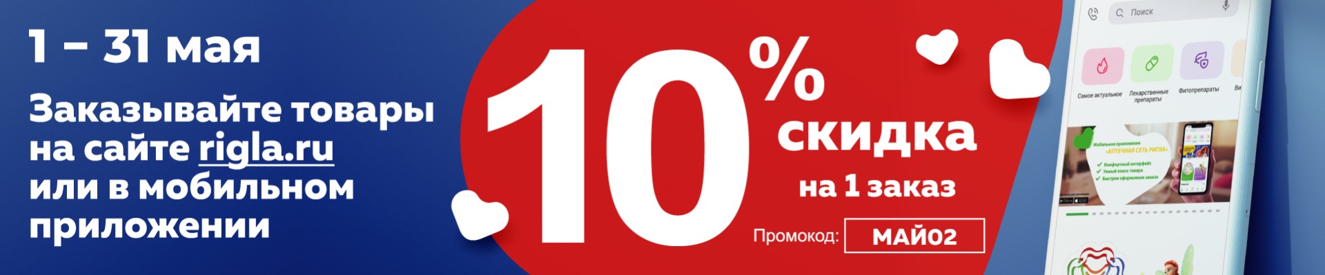 __________ Акция проводится с 01.05.2021 по 31.05.2021 на территории Республики Башкортостан. Акция доступна только авторизованным пользователям. На 1 заказ через мобильное приложение «Аптека Ригла» или на сайте www.rigla.ru, с указанием промокода «МАЙ02», предоставляется скидка до 10%. В акции участвует весь ассортимент, кроме товаров Аллокин-Альфа лиоф. д/р-ра для п/к введ. 1мг №3, Аллокин-Альфа лиоф. д/р-ра для п/к введ. 1мг №6, Арепливир таб.п/о плен. 200мг №40, Оптинол Глубокое увлажнение 0,4% 10мл, Оптинол Мягкое восстановление 10мл, Оптинол Экспресс увлажнение 0,21% 10мл, Ригла маска медицинская трехслойная одноразовая №5, Ферстэйд маска медицинская №5, а также товаров по акциям «Товар дня», «Стоп цена» и товаров по специальному предложению. Организатор акции – ООО «Ригла», ИНН 7724211288. Организатор акции вправе вносить изменения в условия акции и отменить акцию без предварительного уведомления. Подробности акции уточняйте на сайте www.rigla.ru и у сотрудников аптек.