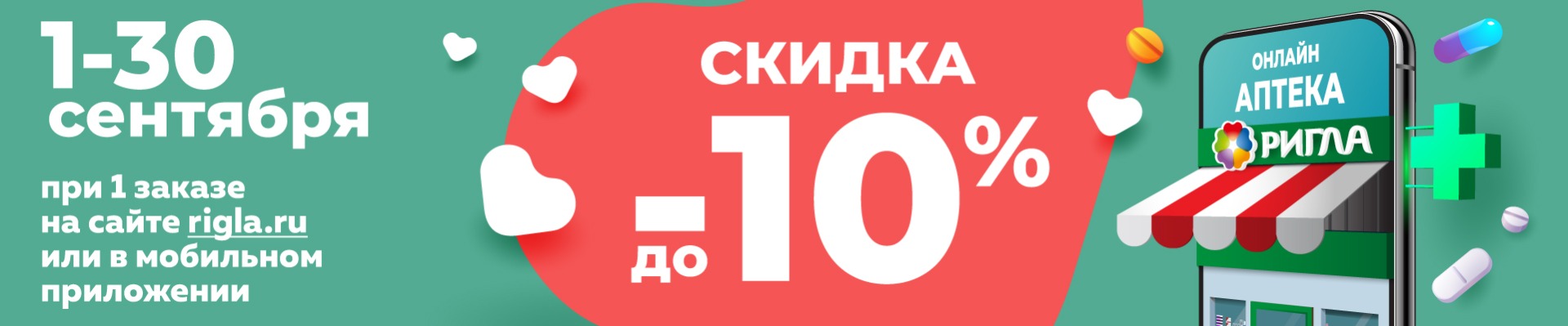 __________ Акция проводится с 01.09.2021 по 30.09.2021 территории Республики Башкортостан. При заказе через мобильное приложение «Аптека Ригла» или на сайте www.rigla.ru, предоставляется скидка до 10%. Скидка будет применена в корзине при оформлении заказа. В акции участвует весь ассортимент, кроме товаров Аллокин-Альфа лиоф. д/р-ра для п/к введ. 1мг №3, Аллокин-Альфа лиоф. д/р-ра для п/к введ. 1мг №6, Аллокин-альфа пор.д/ин. 1мг №3, Арепливир таб.п/о плен. 200мг №40, Оптинол Глубокое увлажнение 0,4% 10мл, Оптинол Мягкое восстановление 10мл, Оптинол Экспресс увлажнение 0,21% 10мл, Ригла маска медицинская трехслойная одноразовая №5, Ферстэйд маска медицинская №5, а также товаров по акциям «Товар дня», «Стоп цена» и товаров по специальному предложению. Акция распространяется только на онлайн заказы. На товары, участвующие в акции, дополнительные скидки не действуют. Организатор акции – ООО «Ригла», ИНН 7724211288. Организатор акции вправе вносить изменения в условия акции и отменить акцию без предварительного уведомления. Подробности акции уточняйте на сайте www.rigla.ru, по телефону 8-8007770303 и у сотрудников аптек.