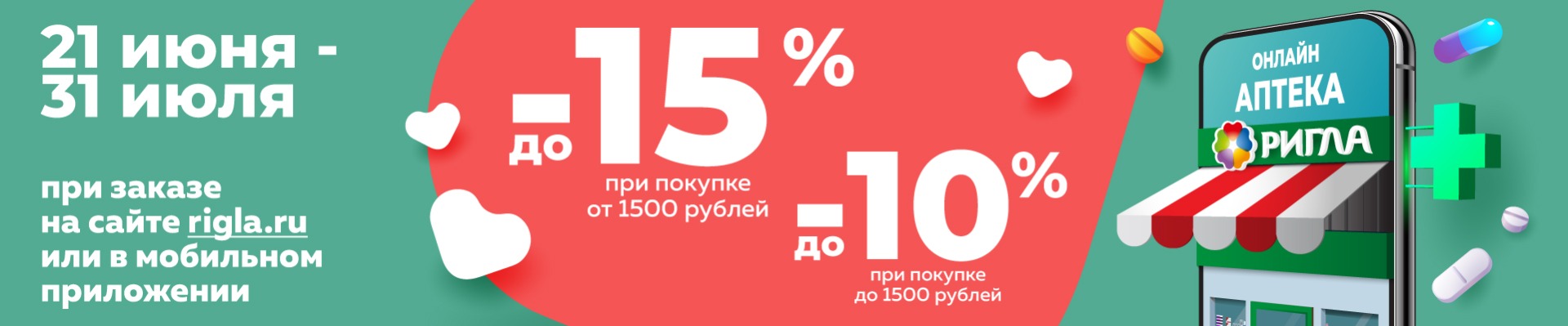 __________ Акция проводится с 21.06.2021 по 31.07.2021 на территории Республики Башкортостан. При заказе через мобильное приложение «Аптека Ригла» или на сайте www.rigla.ru, предоставляется скидка до 10% на покупку до 1500 рублей и скидка до 15% на покупку от 1500 рублей. Скидка будет применена и цена будет пересчитана в корзине при оформлении заказа. В акции участвует весь ассортимент, кроме товаров Аллокин-Альфа лиоф. д/р-ра для п/к введ. 1мг №3, Аллокин-Альфа лиоф. д/р-ра для п/к введ. 1мг №6, Арепливир таб.п/о плен. 200мг №40, Оптинол Глубокое увлажнение 0,4% 10мл, Оптинол Мягкое восстановление 10мл, Оптинол Экспресс увлажнение 0,21% 10мл, Ригла маска медицинская трехслойная одноразовая №5, Ферстэйд маска медицинская №5, а также товаров по акциям «Товар дня», «Стоп цена» и товаров по специальному предложению. Акция распространяется только на онлайн заказы. На товары, участвующие в акции, дополнительные скидки не действуют. Организатор акции – ООО «Ригла», ИНН 7724211288. Организатор акции вправе вносить изменения в условия акции и отменить акцию без предварительного уведомления. Подробности акции уточняйте на сайте www.rigla.ru, по телефону 8-8007770303 и у сотрудников аптек.