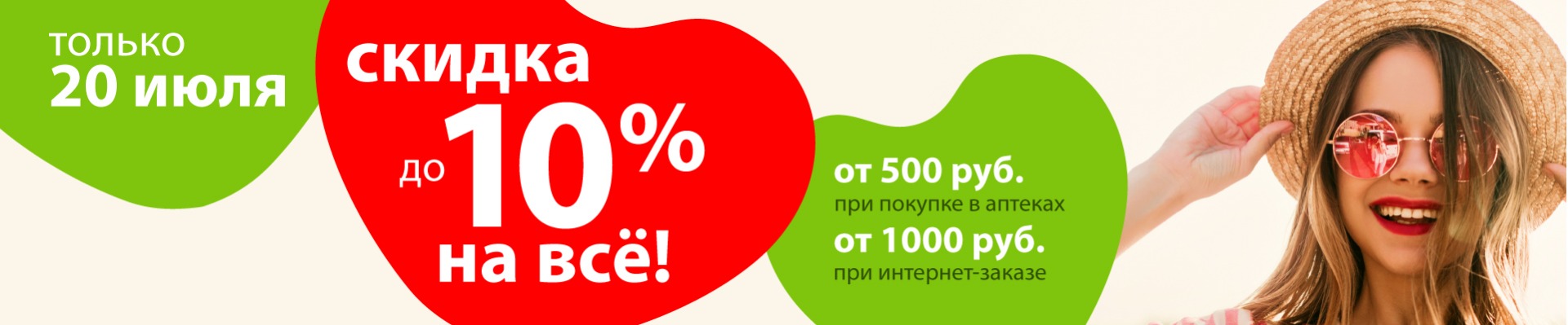 Акция проводится 20 июля 2022 года на территории Вологодской, Ивановской, Тверской и Ярославской областей. При осуществлении покупки от 500 рублей в розничных аптеках или при заказе товаров от 1000 рублей на сайте www.rigla.ru, в мобильном приложении «РИГЛА аптечная сеть» и по телефону call-центра: 8 (800) 777-03-03 предоставляется скидка 10% на весь ассортимент, кроме товаров Аллокин-Альфа лиоф. д/р-ра для п/к введ. 1 мг № 3, Аллокин-Альфа лиоф. д/р-ра для п/к введ. 1мг №6, Аллокин-альфа пор.д/ин. 1мг №3, Арепливир таб.п/о плен. 200мг №40, Оптинол Глубокое увлажнение 0,4% 10мл, Оптинол Мягкое восстановление 10мл, Оптинол Экспресс увлажнение 0,21% 10мл, Ригла маска медицинская трехслойная одноразовая №5, Ферстэйд маска медицинская №5, а также товаров по специальному предложению. На товары, приобретенные по акции, дополнительные скидки не действуют. Если при осуществлении покупки в розничной аптеке товар участвует в нескольких акциях, то применяется наибольшая скидка в рублях. При оформлении интернет-заказа скидка будет применена, и цена будет пересчитана в корзине. При оплате интернет-заказов в аптеке, скидки по акциям, проходящим в аптеке, на этот заказ распространяться не будут. Организатор акции – ООО «Ригла», ИНН 77242112888. Организатор акции вправе вносить изменения в условия акции и досрочно ее завершить без предварительного уведомления. Подробности акции и адреса аптек, участвующий в акции, уточняйте на сайте www.rigla.ru и по телефонам: в Вологде +7 980-656-76-91; в Иваново (4932) 92-04-24; в Твери (4822) 77-70-03; в Ярославле (4852) 20-10-27.