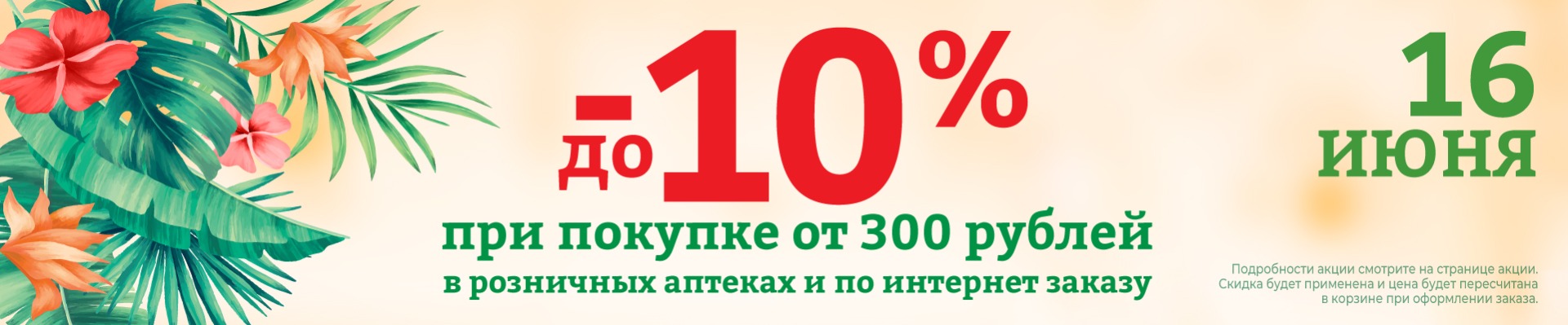 __________ Акция проводится 16.06.2021 на территории Вологодской, Ивановской, Костромской, Тверской и Ярославской областей. При осуществлении покупки от 300 рублей в аптеке или заказе товаров на сайте www.rigla.ru, в мобильном приложении «Аптека Ригла» или по телефону call-центра 8-800-777-03-03, предоставляется скидка до 10% на весь ассортимент, кроме товаров Аллокин-Альфа лиоф. д/р-ра для п/к введ. 1мг №3, Аллокин-Альфа лиоф. д/р-ра для п/к введ. 1мг №6, Арепливир таб.п/о плен. 200мг №40, Оптинол Глубокое увлажнение 0,4% 10мл, Оптинол Мягкое восстановление 10мл, Оптинол Экспресс увлажнение 0,21% 10мл, Ригла маска медицинская трехслойная одноразовая №5, Ферстэйд маска медицинская №5, а также товаров по специальному предложению. На товары, приобретенные по акции, дополнительные скидки не действуют. При оплате интернет-заказов в аптеке, скидки по акциям, проходящим в этот момент в аптеке, на этот заказ не распространяются. Если при осуществлении покупки в розничной аптеке товар участвует в нескольких акциях со скидками, то применяется наибольшая скидка в рублях. Организатор акции – ООО «Ригла», ИНН 7724211288. Организатор акции вправе вносить изменения в условия акции и отменить акцию без предварительного уведомления. Подробности акции уточняйте на сайте www.rigla.ru и по телефону 8-800-777-03-03.