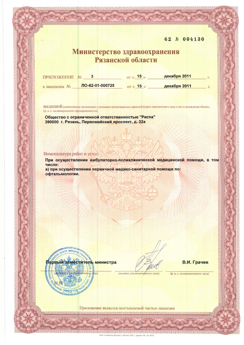 Лицензия № ЛО-62-01-000725 от 15.12.11 года, выданную Министерством здравоохранения Рязанской области (390006, г. Рязань, ул. Свободы, д. 32; тел: (4912) 270771) на осуществление амбулаторно-поликлинической медицинской помощи, в том числе: при осуществлении первичной медико-санитарной помощи по офтальмологии;